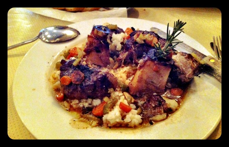 The single room was packed with noise. Instead of menus, there was a board on one of the walls, with the day’s specials handwritten. Now starving, we dove right in and started eating. The Osso Buccho was highly recommended on Yelp, as was the Lobster Ravioli, and so that’s what we got. Our waitress was friendly, and convinced us to get a salad as well, which was simple but quite nice.