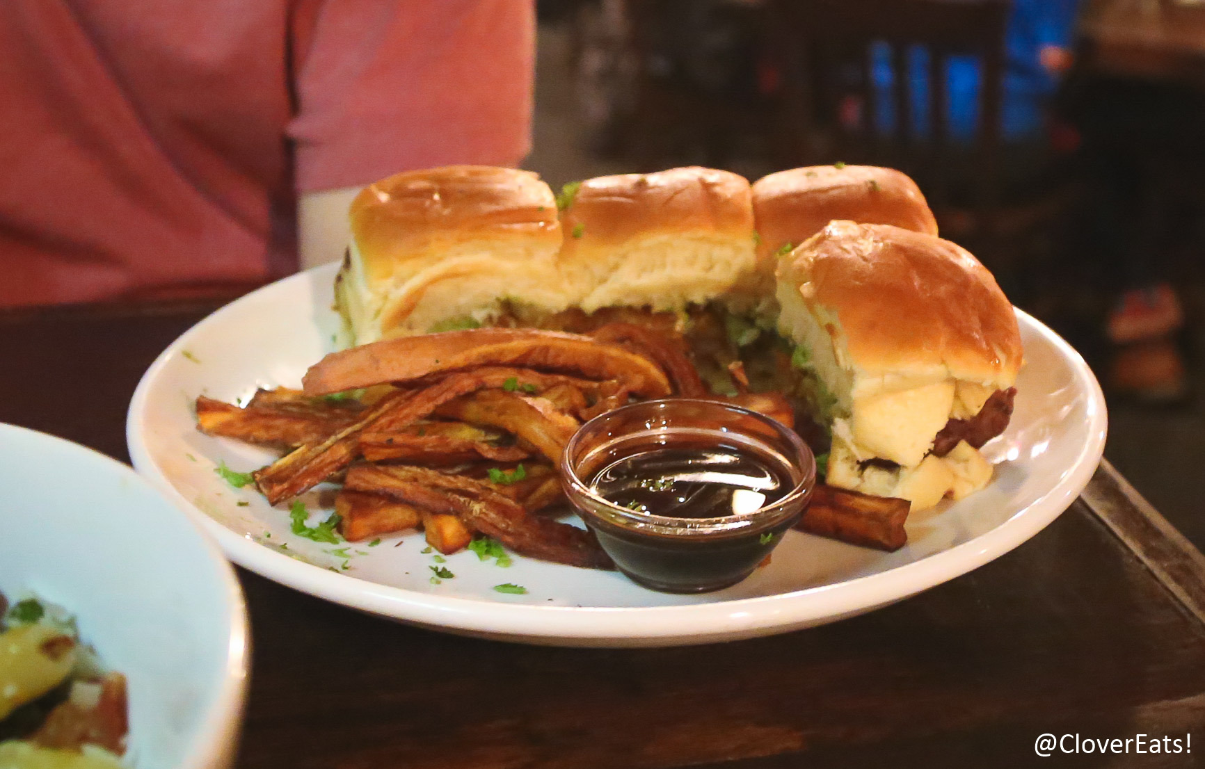 Southwest Sliders: four sirloin sliders topped with guacamole, crispy onion straws, pepper jack cheese, and chipotle aioli. served on Hawaiian rolls; Sweet Potato Dunkers: oven roasted hand cut sweet potato “fries” served with a ginger-soy dipping sauce
