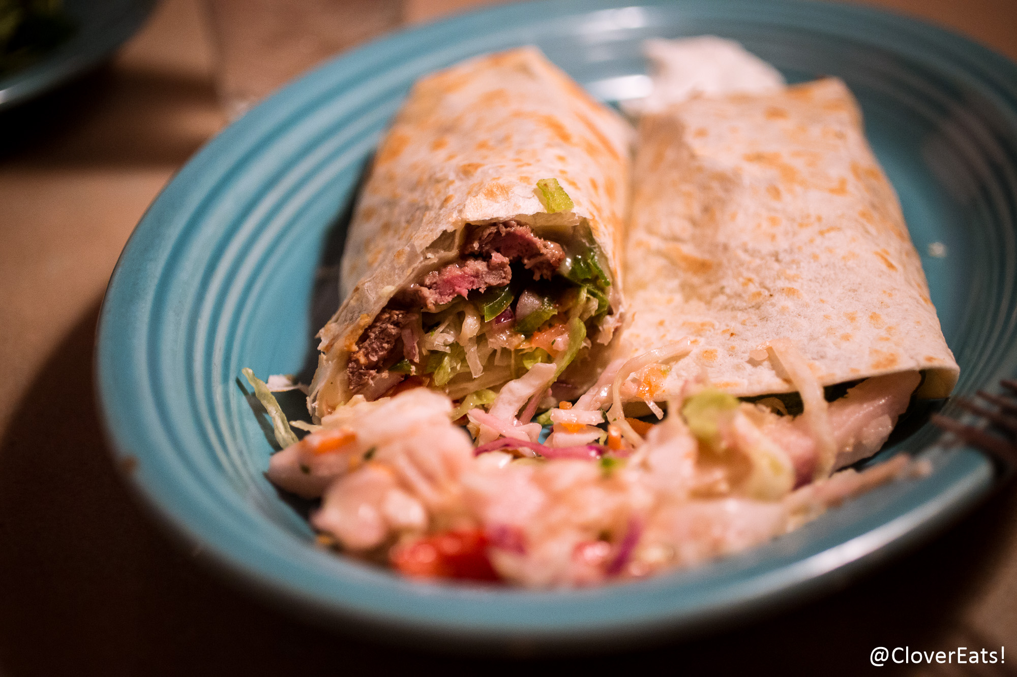 My Habanero New York Strip Steak Southwestern Roll Up with red and green peppers, onions, chihuahua cheese, lettuce, tomatoes and sour cream, served with jicama slaw. This slaw was very refreshing, and the dish was a generous serving; I took most of it home and made additional meals out of it!